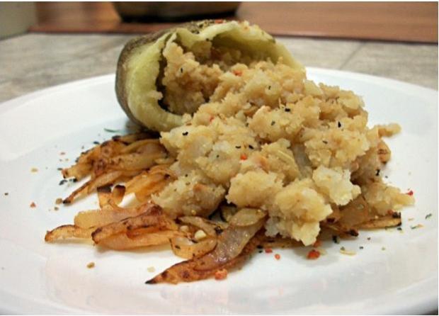 Assuming your hash browns are done, go ahead and dump them onto a plate. They’ll be super hot, so it’ll be good to let them cool for a bit. While they’re cooling, coat the inside of the potato skin with salt and re-add the potato/peanut butter mixture to the inside. Put the skin on top of the hash browns, then sprinkle the whole mixture with Mrs. Dash. Me being me, I can’t taste Mrs. Dash very well at all, but I added it anyway for a little color. I don’t really know how it tastes with the spices, so omit it if you want.