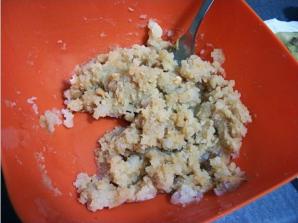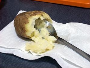 Anyway, while that’s cooking, take the other half of the potato, put it on a paper towel, and microwave either for 4 minutes on high or on the “potato” setting on the microwave. Once it’s done, take it out, let it cool for a minute or so, then saw off the end where the potato was exposed from grating (it’ll be hard as a rock anyway). Scoop the flesh out of the skin into another bowl, trying to leave the skin intact. Unless you’re not into eating potato skin; in which case, maul away and just omit the skin from the final conglomeration.