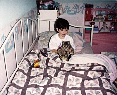 Me with Brutus (the black one) and Lena, siblings from a litter from my mom’s older cat, Gracie. Haha, I have so much paint on my pants. And the cats are like let me go, weirdo.