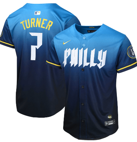 The two things I absolutely never think of when I think of the city of Philadelphia are 1) the color blue, and 2) a serial killer font. That 7 looks like a pipe wrench. I know they put the Liberty Bell on the hat, but come on. A gold/copper jersey with a big-ass black lightning-shaped crack going down the front of it would be so much more iconic.