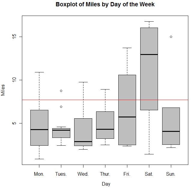 Boxplot time! Here are miles by the days of the week (the red line is the average 7.71 miles).