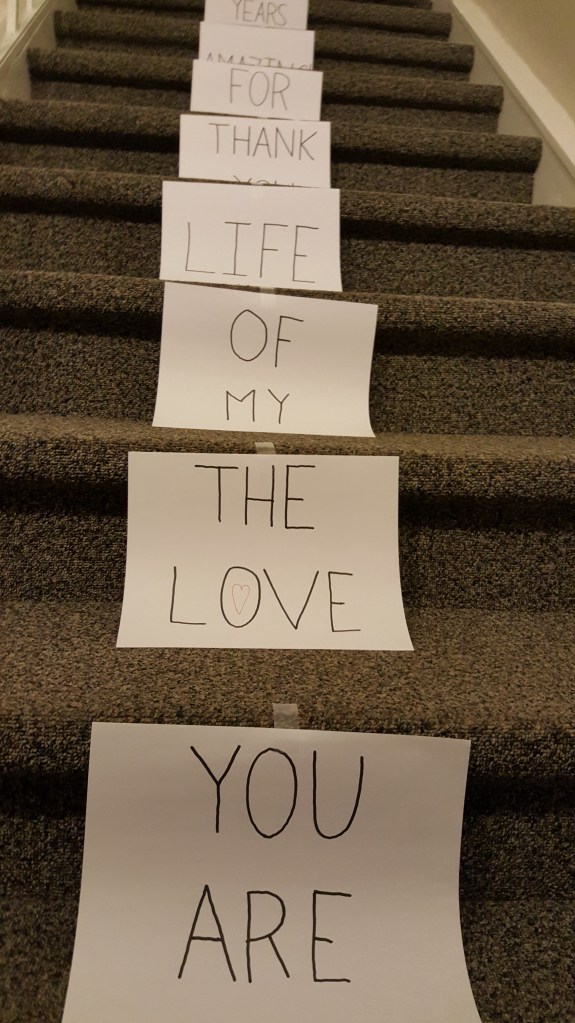 These ran all the way up the stairs to our condo (we’re the only ones that use that set of stairs) to a note on the door saying how happy he was that we were together and how he wanted to be with me for the rest of my life.