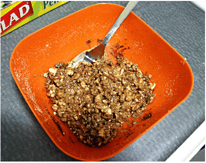 4. Now just beat the hell out of it. I used my “grad school is destroying my soul” frustration augmented with the back of a spoon. Try to get the nuts totally pulverized, but if you want a few larger chunks of Pocky and cereal, that’s cool. I realized after I was done with this whole endeavor that grinding these ingredients into a coarse powder would probably work best, but I have no such apparatus for accomplishing that (and I’m too lazy to beat a baggie with a spoon for an extended period of time), so I just left it kinda chunky.