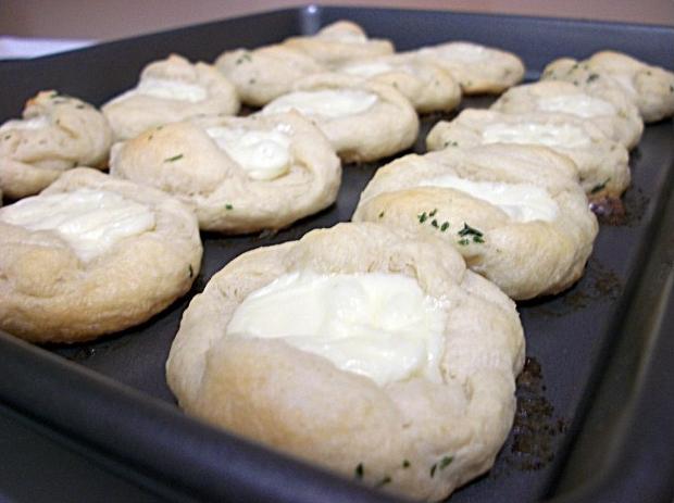 Now bake according to the instructions on the crescent can (I believe it’s 10 – 12 minutes at 375°). When you take them out, you’ll notice that the crease has now reopened, leaving a nice neat little pool of cheese in the middle of a doughy bowl. Freaking tasty! They’re also good cold.