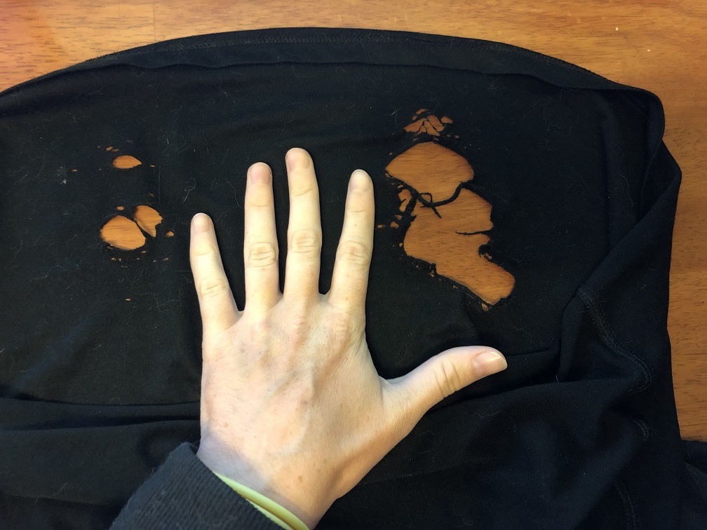 Yes, those are holes. Yes, they go completely through the fabric. My hand is there for scale. The holes are at/near my lower back due to my backpack rubbing there for 15+ miles almost every day.