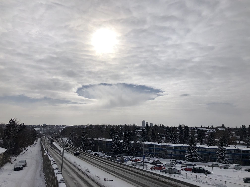 This sort of phenomenon is called a fallstreak hole (or cavum, hole punch cloud, punch hole cloud, skypunch, cloud canal, or cloud hole…and I can’t tell you which of those names is the coolest ‘cause they all are). It occurs when the water temperature in the clouds is below freezing but the water is in a supercooled state (being below freezing but not yet a solid). When the ice crystals do form, the droplets around the crystals evaporate, leaving the hole.