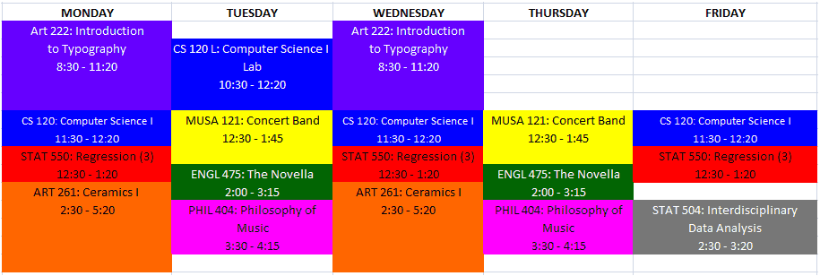 So I should have been born in like 1991, because the U of I has had some really great classes these past two years. Here are the 25 credits I would like to take this semester, if I were there (click on image to bring to full size):