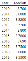 Here are the median song lengths per year (since song lengths were highly skewed).