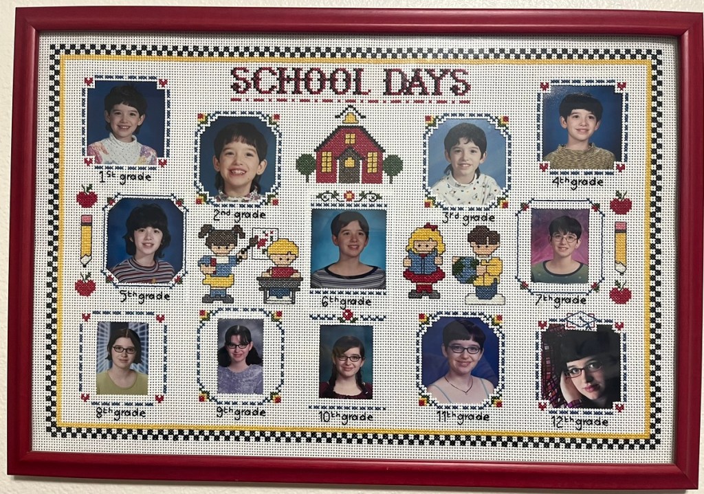 Sometime back in the Stone Age, my grandma cross-stitched this little picture-holder thingy that was designed to house one of each of my school pictures from first grade all the way up to 12th grade.