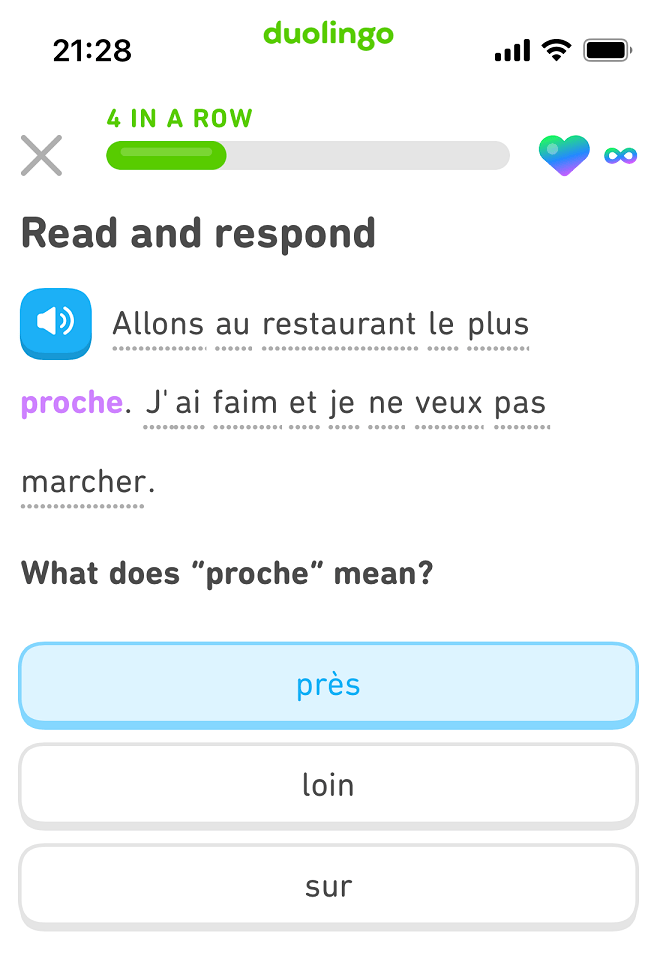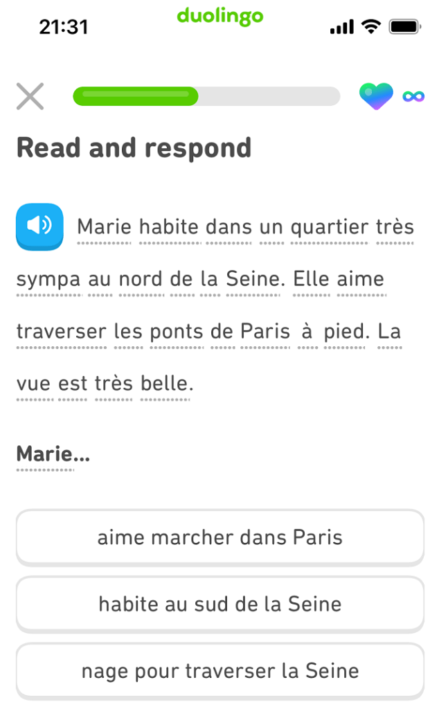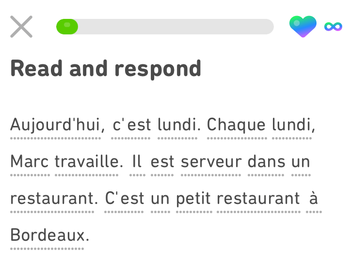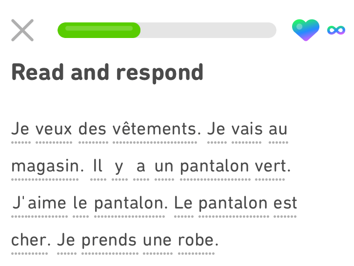 This is a new type of Duolingo exercise, and I really like it. You’re getting your current knowledge of French tested at the same time you’re learning new words. I hope there are a lot more exercises like this!