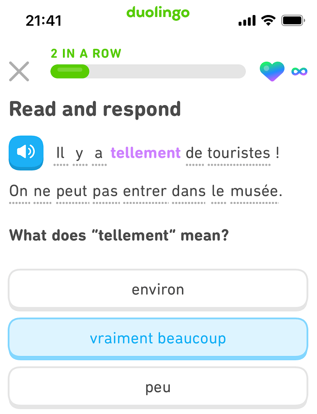 I’d say that’s pretty good for only having one French class and using Duo for a bit less than a year.