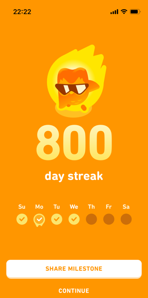 I’ve been doing Duolingo for 800 days, yo! That’s a long time.