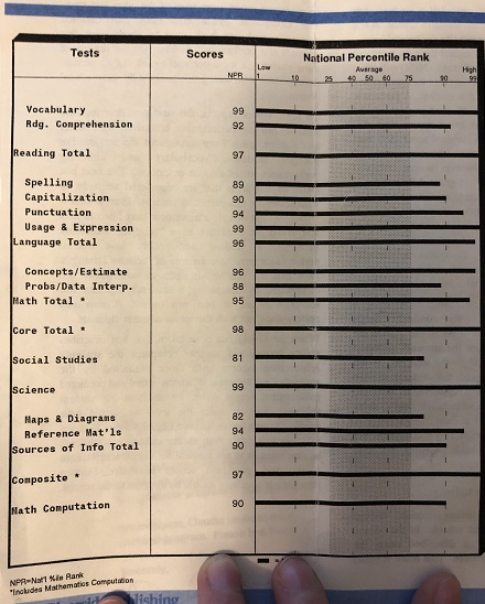 More test results! This is from the Iowa Test of Basic Skills that I took in 5th grade. I’m surprised my spelling score was so low; I was a pretty good speller in elementary school. I don’t remember what the “social studies” category actually was testing, but I clearly didn’t know the stuff.