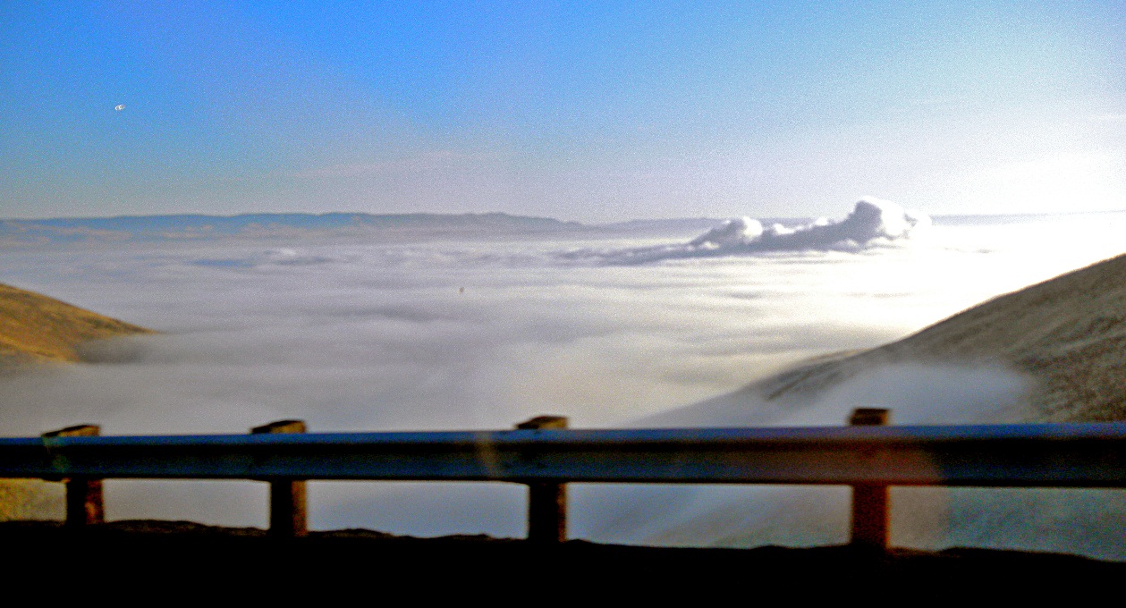 These pictures, taken yesterday around 3 PM, show the result of an inversion, or “a deviation from the normal atmospheric property with altitude” (thanks, Wiki). In the case of Lewiston here, the inversion involved temperature: Lewiston was uncharacteristically colder than the surrounding higher elevations (it was 21 degrees in Lewiston, according to my dad’s car, whereas it was about 32/33 in Moscow).