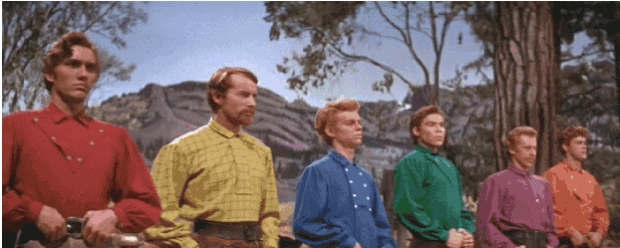 Near the middle of the movie the seven brothers (well, the six that aren’t married yet), now tamed by Millie, go to a barn raisin’ in town. Ladies and gentlemen, Team Rainbow:
