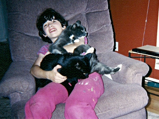Me with Brutus (the black one) and Lena, siblings from a litter from my mom’s older cat, Gracie. Haha, I have so much paint on my pants. And the cats are like let me go, weirdo.