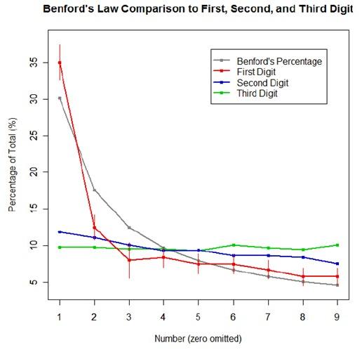 For the first graph, I wanted to show how quickly the law breaks down after the leading digit (that is, I wanted to see if the second and third digit distributions were more uniform). I took a set of 10,000 randomly generated numbers, took the first three digits of each number, and created a data set out of them. I then calculated the proportion of 1’s, 2’s, 3’s…9’s in each digit place and plotted them against Benford’s proposed proportions. Because it took me literally two hours to plot those stupid errors of estimate lines correctly (the vertical red ones), I just did them for the leading digit.