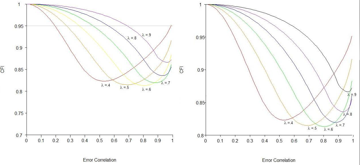 This code is old code for a plot of the comparative fit index’s (CFI’s) behavior for a 1-factor model with eight indicators for an increasingly large omitted error correlation (for six different loading sizes; those are the colored lines). As you can see in the file, there are quite a few (okay, a lot) of lines “commented out,” as indicated by the pound signs in front of the lines of code. This is because for each chunk of code, I had to write a specific line for each of the different plots. Each of these customizing lines took quite awhile to get correct, as many of them refer to plotting the “λ = some number” labels at the correct coordinates as well as making sure the axis labels are accurate.