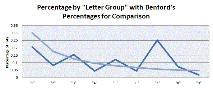 For the second graph, I took a data table from Wikipedia that listed the size of over 1,000 lakes in Minnesota (hooray for Wiki and their large data sets). I split the data so that I had only the first number of the size of the lakes, then calculated the proportion of each number. I left out the zeros for consistency’s sake. I did the same with the first 10,000 digits of pi, leaving out the zeros and counting each number as a single datum. I wanted to see, from the second graph, how Benford’s law applied to “real life” data and to a supposedly uniformly-distributed set of data (pi!).