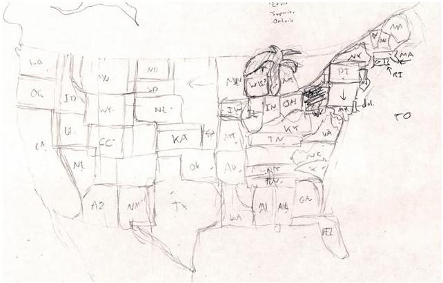 Apparently, in my mind, the Midwest is an even bigger expanse of nothing than it is in real life, the Great Lakes are a palm tree, West Virginia is a scribble, and New England is experiencing severe continental drift along the state border lines.