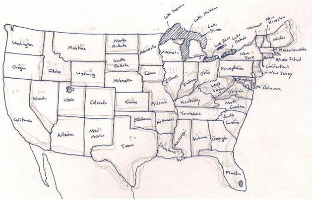 The proportions (and some locations) really start to suck east of the Mississippi River, but at least I didn’t miss anything. Indiana and Ohio look crappy ‘cause I screwed up that general area and just went with it. The rest look crappy ‘cause I don’t know what they look like…in particular, I couldn’t for the life of me remember how the hell West Virginia is shaped, so I just kinda threw it on there where there was a gap in the states yet and called it good. Hahaha, Wisconsin is so deformed, but I got the Great Lakes right (edit: I also just realized I forgot to put the tail on the “g” so it looks like I wrote “Lake Michican.” You’d be surprised how often I forget to complete letters before moving on to the next one. Or maybe you wouldn’t, it is me, after all).
