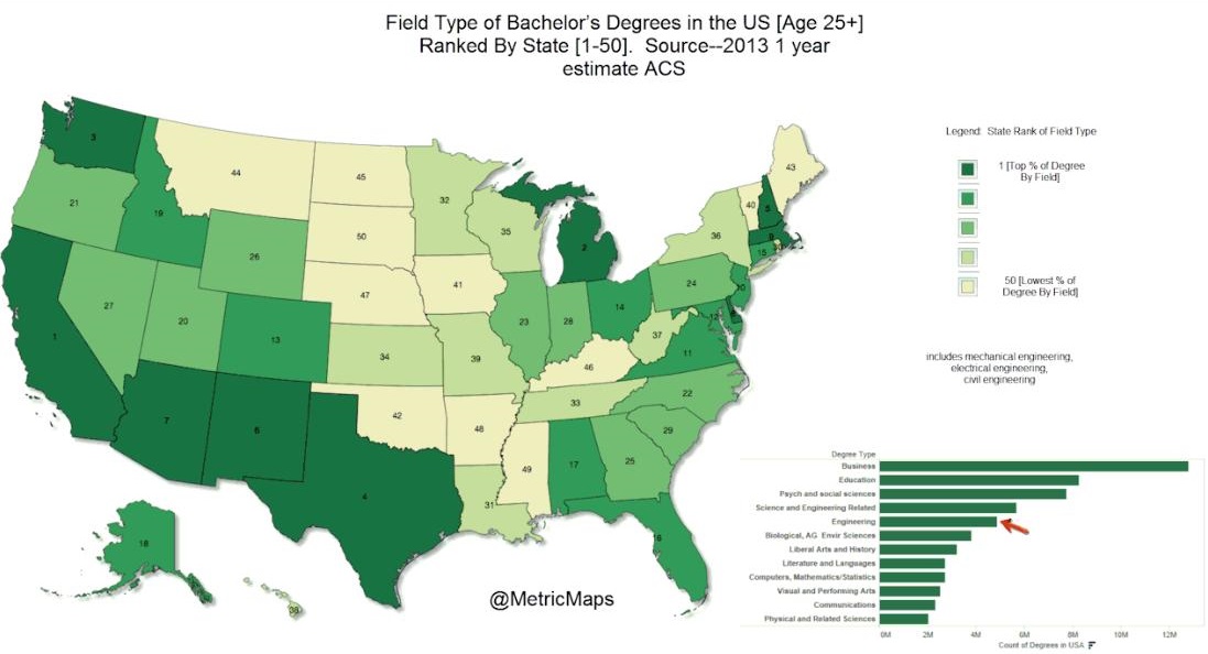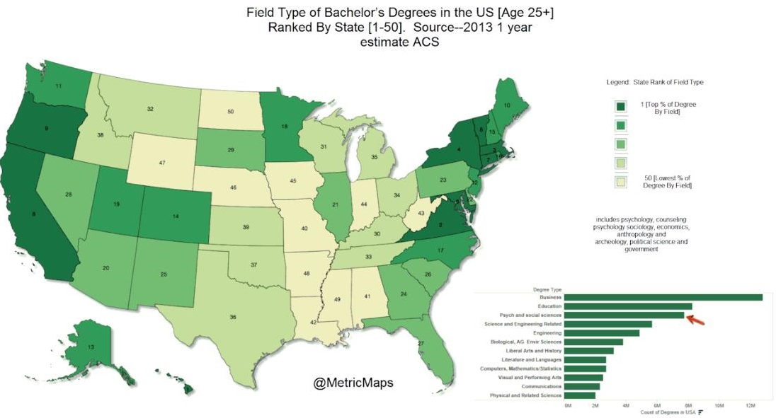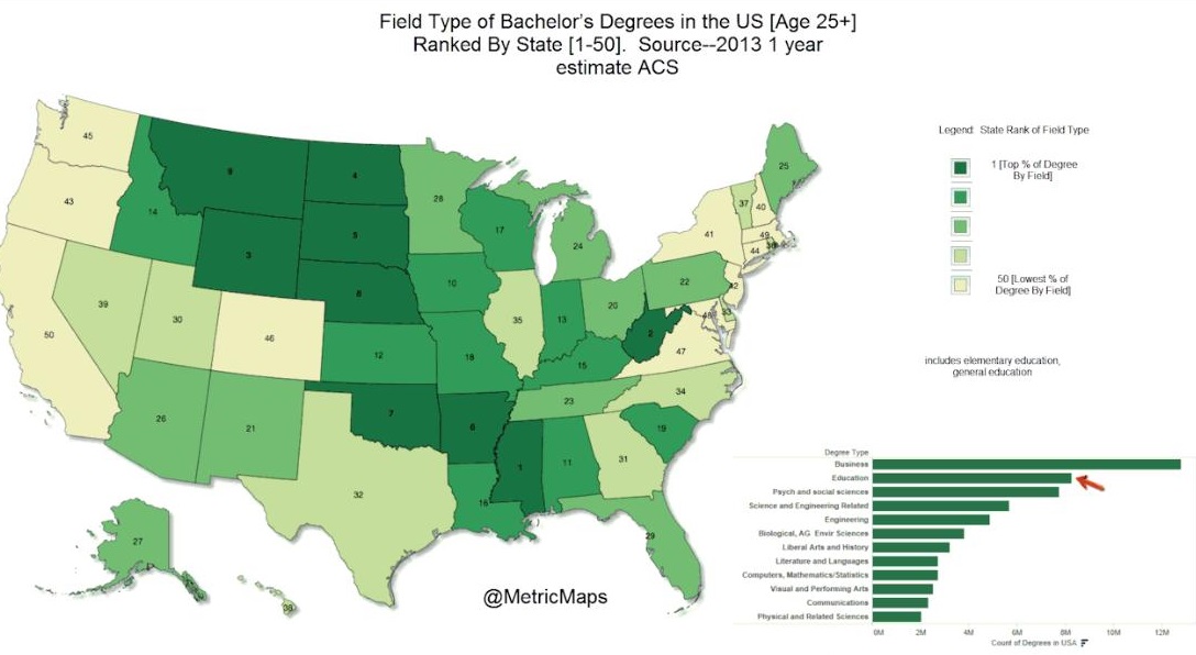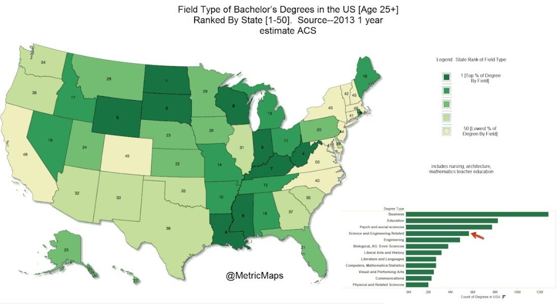 The above.gif (source) shows the field type of Bachelor’s degrees by state, ranked by top percent of degree by field. I can’t read as fast as the .gif goes, so here are the screenshots for each type of degree. Click on the piccys to make them grow.