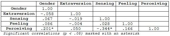 So what does all this mean? Well, pretty much nothing, statistically-speaking. The only two significant correlations were between gender and Perceiving/Judging and Sensing/Intuiting and Perceiving/Judging. From the coding, the first significant correlation means that in the sample, there’s a tendency for males to score higher on Perceiving than Judging, and for females to score higher on Judging. The second significant correlation means that in the sample, there’s a tendency for those who score high on Feeling tend to score high on Perceiving, and a tendency for those to score high on Thinking to score high on Judging.