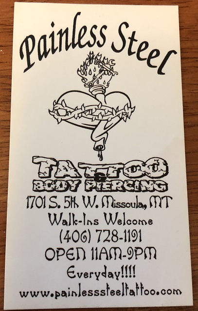 A card from the tattoo/piercing shop where Aaron and I got our piercings back in 2008. That was a fun little road trip.