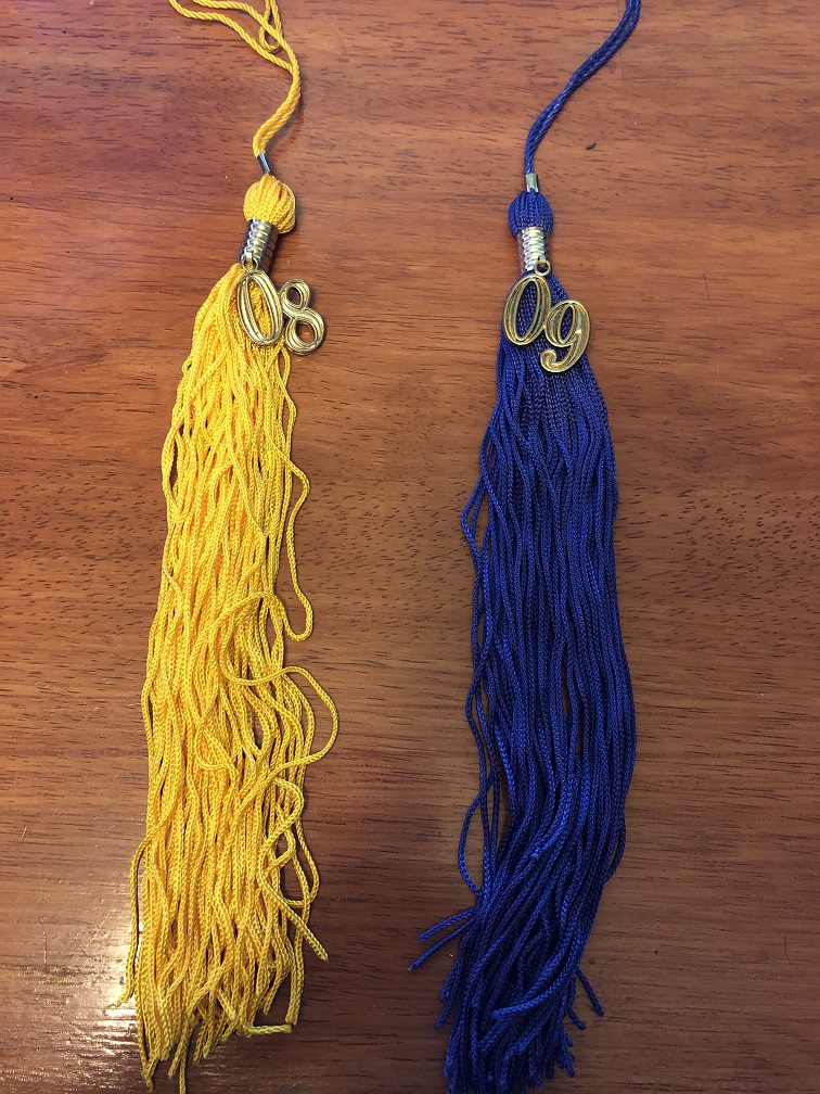 My graduation tassels from my psych degree and my philosophy degree. I didn’t get one for my math degree (2012) because I didn’t go to graduation and didn’t go pick up my graduation crap. I was having a bad end of the semester and was inundated with papers to grade from STAT 251, so yeah. Would’ve been nice to have one, though.