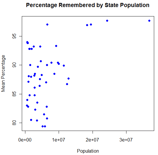 Here you’ve got those few outlier states like California and Texas with mega populations that also appear to be at the top of the percentage remembered axis. Other than that, though, there doesn’t appear to be any sort of trend going on here. At least, in my opinion.