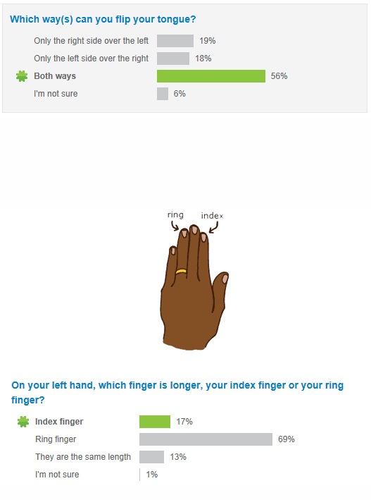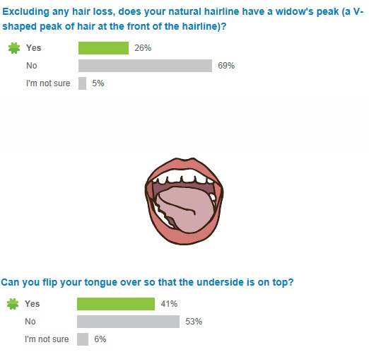 So 23andMe has a bunch of little surveys you can opt to take. Once you answer them you’re shown the stats for each question based on the people who have already taken the surveys.